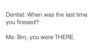 Got in my car, went to check my bag and there was no floss to be found. Not even one of those fluoride sticks. It would seem dentists have had enough. We appease them, we tell them we floss, but they know we’re lying. They’re literally inside your mouth, they can tell you haven’t flossed since the Bush administration.