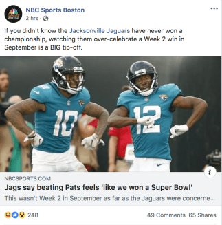 So I just have to tip my cap to the Jaguars. It’s only Week 2 so I hope they aren’t riding too high….