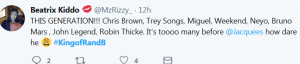 The list themselves are only a bit intriguing. I was surprised how many people had Trey Songz. He makes bangers and definitely some of the top baby making music of our era, but didn’t know people considered him a legit R&B guy. Bruno Mars is nonsense, as he falls into the “Uptown Funk” genre. Also the Weekend is just weirdass (but good) music, dk if thats R&B. I know people like to show they are as accepting as entirely possibly but sorry, Frank Ocean is trash, or at least not the king of R&B. I have no problem with the guy, but I think people are throwing in Robin Thicke’s name just because they want to see the world burn.