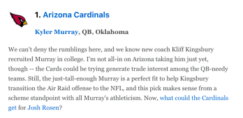 The NFL Draft is just a few weeks away and we are in full on wild speculation mode the closer we get. Kyler Murray to the Arizona Cardinals at No. 1 overall seems to be a done deal if you listen to pretty much anyone in the media these days.