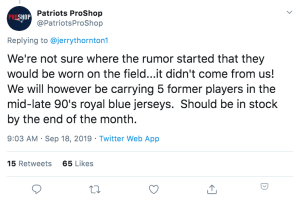 YESSS. I’ve been campaigning for the Patriots to break out these bad boys for yearsss. The red throwbacks and these beauties are the only thing I will wear when playing Madden. They’re just so awesomely bad and a perfect time capsule of the 90s with the garish two-toned blue and the oversized logos on the sleeves. Now granted this is still just a rumor that seems to have taken on a life of its own after a non-blue check marked account tweeted it out. So lets all take it with a gigantic grain of salt, but theres also this.