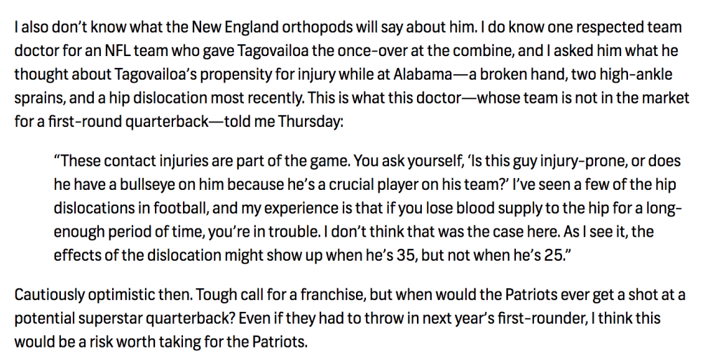 Over at Pro Football Talk Peter King has the Patriots trading up to No. 13 to snag a sliding Tua after the Dolphins take Oregon QB Justin Herbert at No. 5. Well that would assume Detroit (could use a young QB), Jacksonville (could definitely use a QB), and the Chargers (Tyrod Taylor is QB1 right now) all pass on him. Even with the medical red flags considered, I find that pretty hard to believe. King’s breakdown of the scenario below: