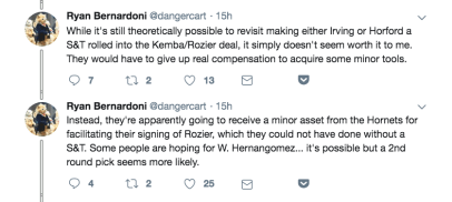 Some clarity on the Rozier/Kemba sign-and-trade: The Cs did this to keep options open for potential three-team sign-and-trades. But even if it stays as a 2-team transaction, Boston is expected to receive some compensation from the Hornets.