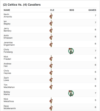 Of the 22 ESPN “Experts” polled, all but three picked the Cavs to win the series, two of whom are Boston writers. And only 5 predicted the series would even go 7 games, so we can’t just turn around now and say it was some miraculous effort that LeBron willed this team to a win after you all picked him to win outright 2 weeks ago.