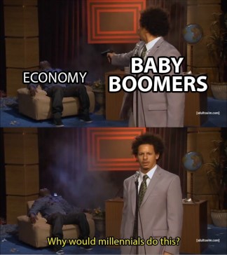 But when millennials complain about anything we get told we need to pull ourselves up by our bootstraps, ignoring the fact that the generation before us literally killed social security and luxuries like “retirement” for their kids. Millennials basically just get the speech from The Departed.