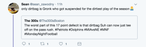 This was a game I worried about going into for the sole reason that dirtbag Ndamukong Suh gets off on hitting Brady late, low, and hard. And the delusional Dolphins fans that defend him.