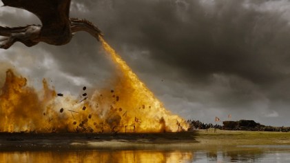 Season 5: “The Dance of Dragons” (Stannis roasts his daughter, Jon Snow brings the wildlings through the Wall, Khaleesi rides Drogon to safety out of the Mereen fighting pits.)