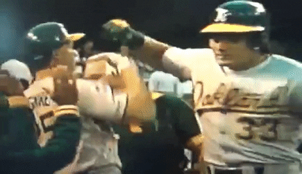 I know we all grew up on the adrenaline and testosterone (and the cream and the clear) of the late 80s and early 90s, but come on man. Maybe the reason Jose Canseco and Mark McGwire were able to violently smash their forearms together after hundreds of home runs is because they were juice up goons with arms the size of folding tables?
